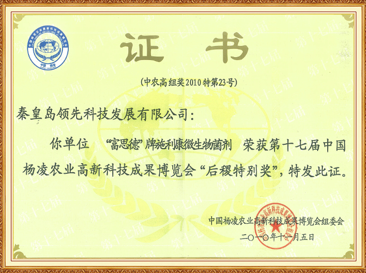“富思德”牌施利康微生物菌劑—第十七屆中國(guó)楊凌農(nóng)博會(huì)“后稷特別獎(jiǎng)”
